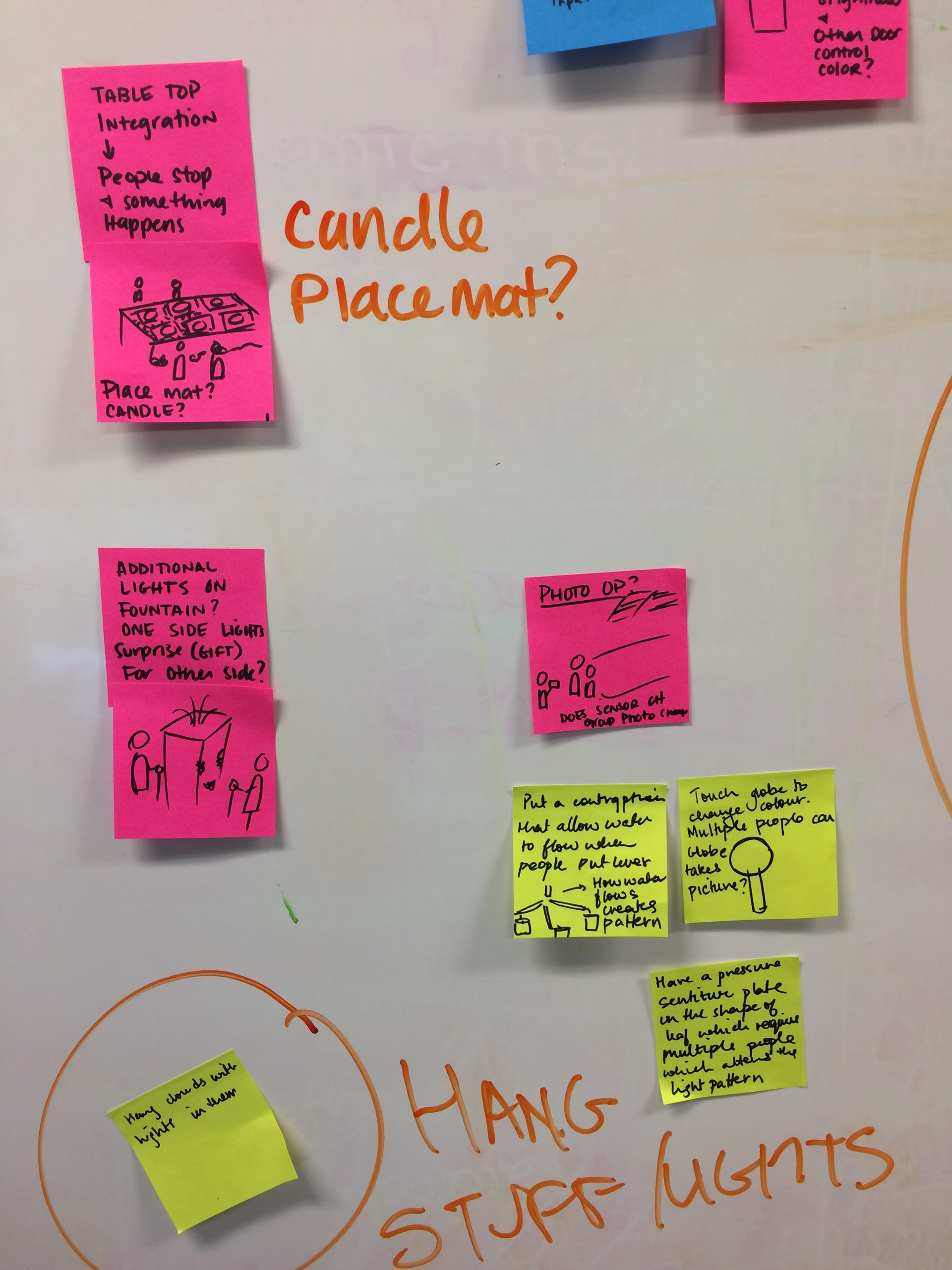 Patrons can control the lighting (i.e. color, pattern, etc.) on the other side of the room by using touch sensors hidden in the bricks. These touch sensors will have a whimsical, colorful look to them so that visitors are surprised when they look inside the gaps of the walls.